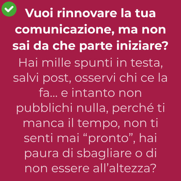 Può mancare il tempo, la visione strategica, o anche solo la costanza.Ti capisco.Comunicare bene non significa semplicemente saper scrivere e scegliere le parole giuste.Significa saper organizzare le idee con chiarezza, coerenza e originalità, dare il giusto ritmo alle frasi, trovare uno stile riconoscibile, costruire una presenza coerente nel tempo e tanto altro.Il tuo personal brand merita di riflettere la tua professionalità.E se ti serve una guida che ti aiuti a: