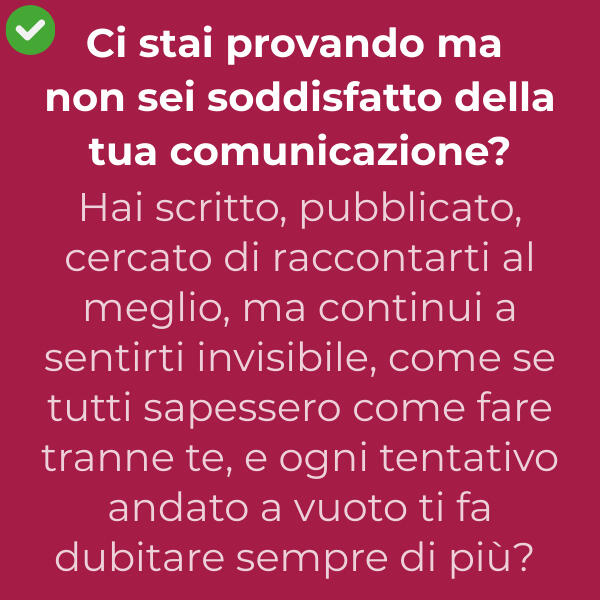 Tutto ciò che fai non conta nulla se non sai raccontarlo.Se ti confondi tra infinite etichette che popolano il mercato, anche il tuo pubblico finirà per scegliere a caso / per abitudine.Hai bisogno di una comunicazione che rifletta davvero la tua identità – chiara, coinvolgente, unica come la storia che porta con sé – cioè la tua!